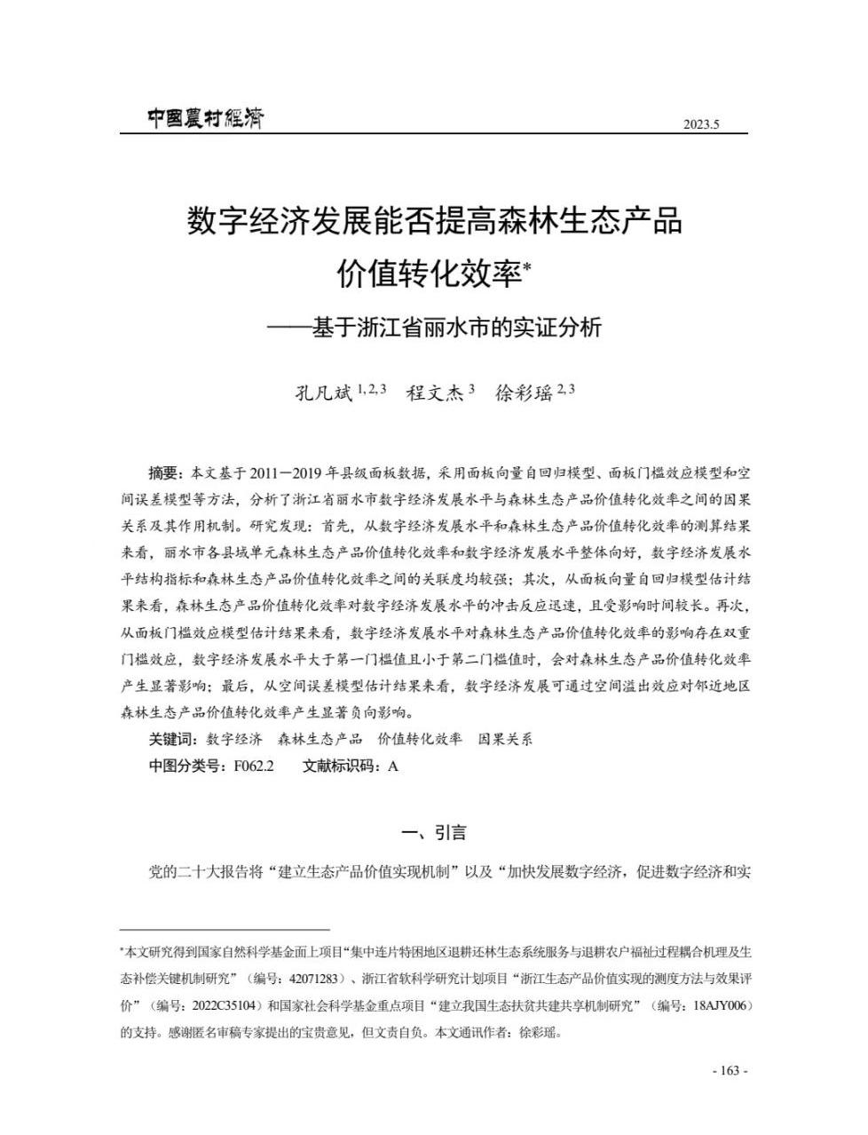 近日,由威尼斯官网孔凡斌教授团队完成的原创性学术论文《数字经济发展能否提高森林生态产品价值转化效率——基于浙江省丽水市的实证分析》在浙大一级期刊《中国农村经济》2023年第5期发表。论文第一作者为孔凡斌教授,通讯作者为徐彩瑶博士,农林经济管理学2020级硕士研究生程文杰为合作作者。该文是孔凡斌教授主持的国家自然科学基金面上项目(编号:42071283)、国家社会科学基金重点项目(编号:18AJY006)和徐彩瑶博士主持的浙江省软科学研究计划项目(编号:2022C35104)的重要阶段性成果。
