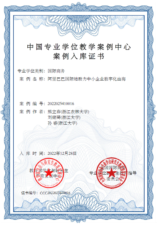 近日,教育部学位与研究生教育发展中心和全国教育专业学位研究生教育指导委员会公布了中国专业学位教学案例中心案例库入库评审结果,威尼斯官网应用经济学科熊立春副教授与浙江大学经济学院刘健琦、孙睿等人合作撰写的国际商务教学型案例《阿里巴巴国际站助力中小企业数字化出海》成功入选中国专业学位教学案例中心案例库,应用经济学科蒋琴儿教授、钱志权副教授和孔令乾博士等给与了案例完善意见。该案例主要描述了阿里巴巴国际站如何借助数字化技术与产品,精准匹配跨境贸易双方业务需求的全新模式。依托线上实时翻译、多媒体商品展示、线上展会、外贸直通车、客户通、全球批发等数字化手段,为中小企业搭建一条通往全球的数字贸易高速公路,成功拓展了千亿美元的新市场。