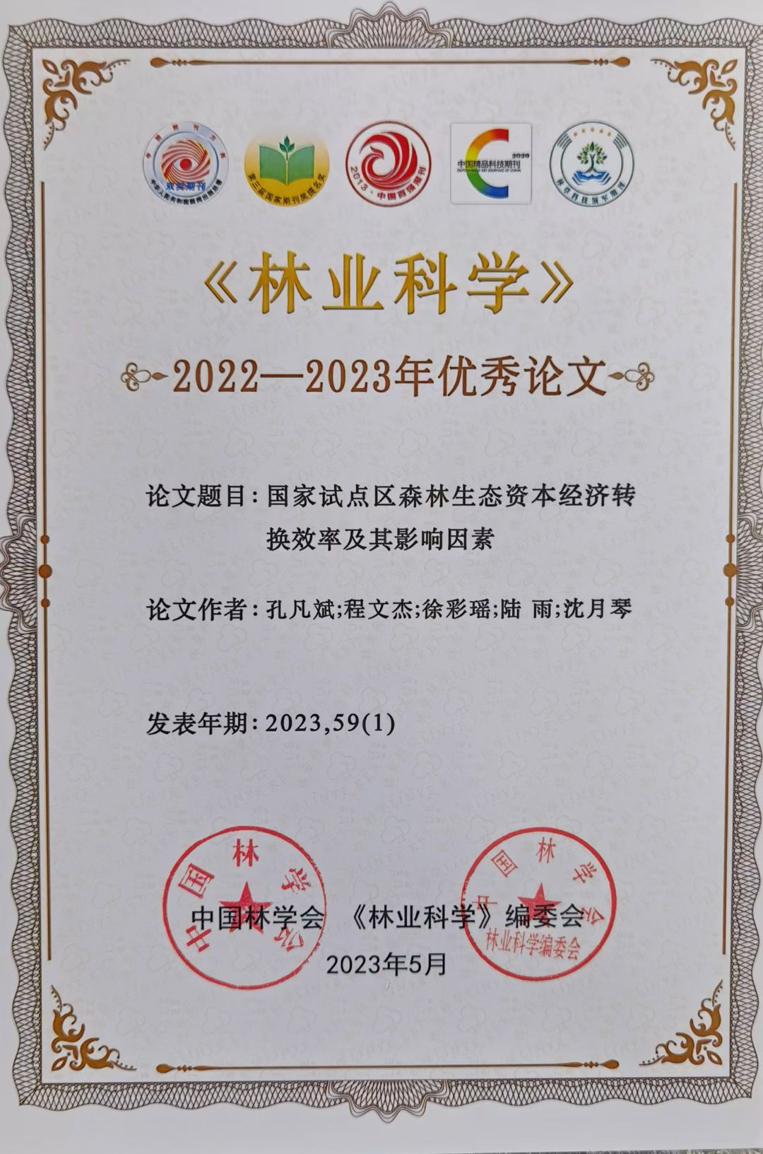 近日,浙江省新型重点专业智库——威尼斯9499登录入口生态文明研究院首席专家、执行院长孔凡斌教授团队合作撰写的研究论文《国家试点区森林生态资本经济转换效率及其影响因素》被中国林学会《林业科学》编委会评为2022-2023年优秀论文。