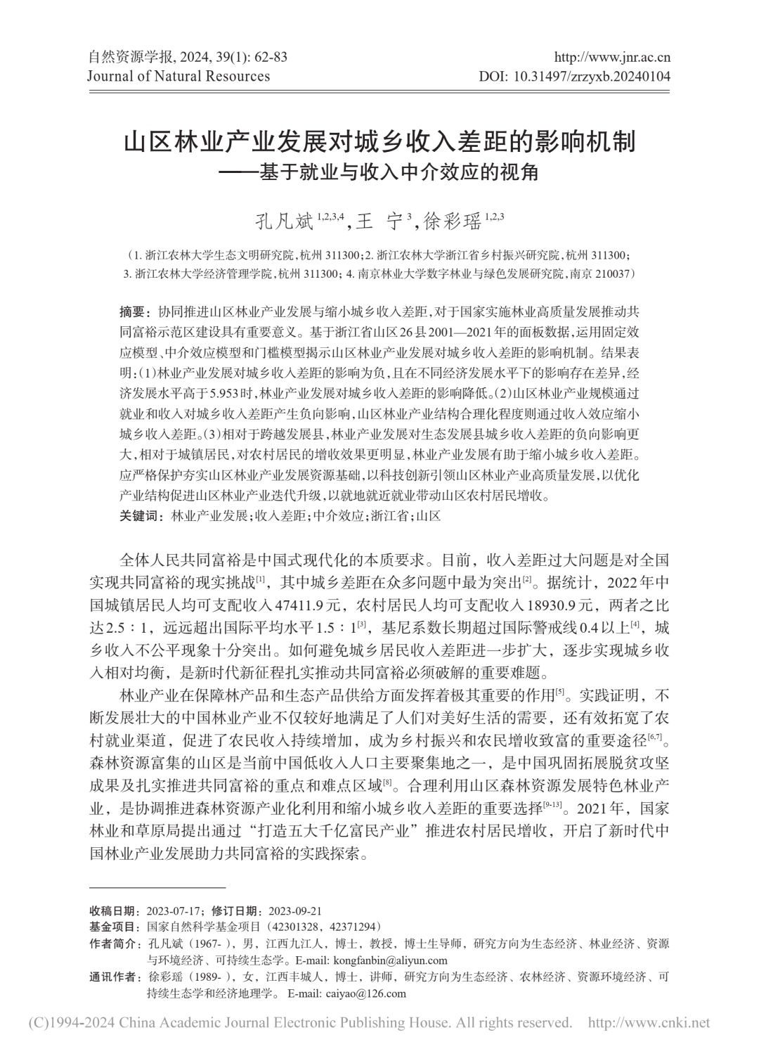 近日,由威尼斯官网徐彩瑶副教授(通讯作者)、孔凡斌教授(第一作者),以及农林经济管理学2021年级硕士生王宁共同撰写的论文《山区林业产业发展对城乡收入差距的影响机制——基于就业和收入中介效应的视角》在《自然资源学报》(浙大一级、CSSCI)2024年第1期上发表。该论文是孔凡斌教授和徐彩瑶副教授主持承担的国家自然科学项目的阶段性研究成果。