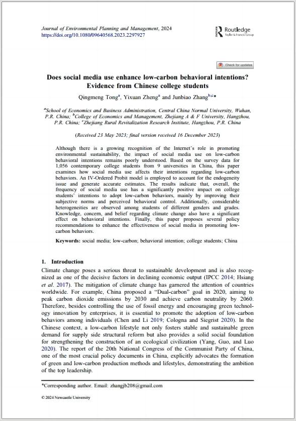 1月24日,团队研究成果“Does social media use enhance low-carbon behavioral intentions? Evidence from Chinese college students”在环境规划与管理研究类SSCI期刊Journal of Environmental Planning and Management(IF=3.9,JCR二区)线上发表。