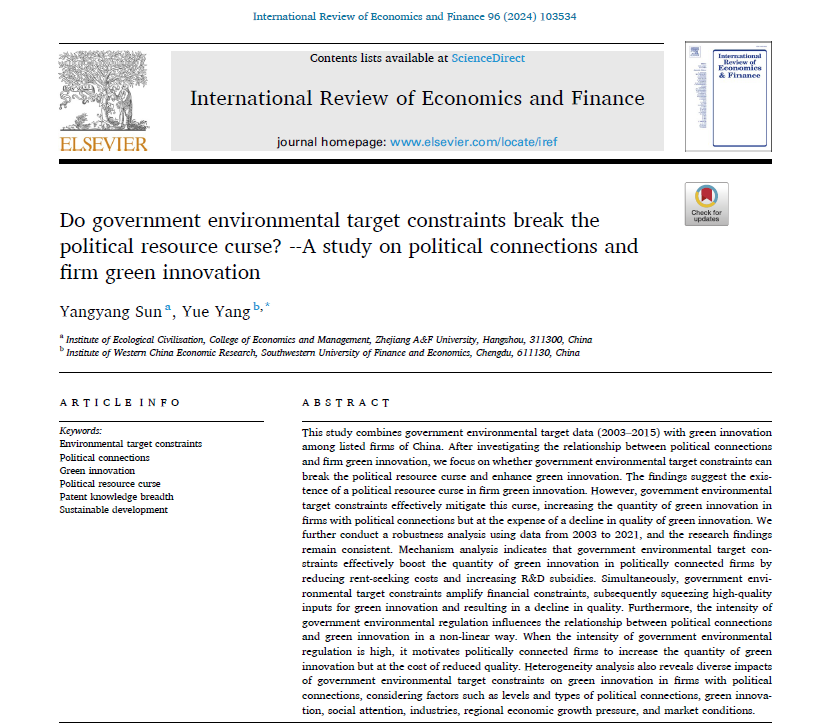 近日,威尼斯官网应用经济学学科孙阳阳博士撰写的论文《Do government environmental target constraints break the political resource curse?—A study on political connections and firm green innovation》上发表,孙阳阳博士为该论文第一作者。该期刊是SSCI一区期刊,最新影响因子为4.8。