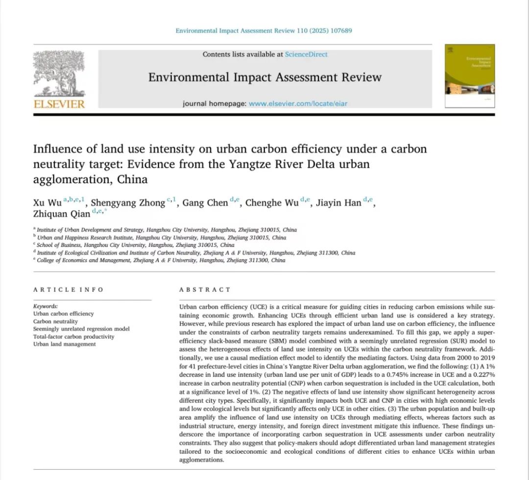 近日,钱志权教授与浙大城市学院吴旭副研究员、钟声扬等合作撰写的论文《Influence of land use intensity on urban carbon efficiency under a carbon neutrality target: Evidence from the Yangtze River Delta urban agglomeration, China》在SSCI期刊《Environmental Impact Assessment Review》(中科院一区Top期刊,西安交通大学等认定的管理类国际知名期刊,IF:9.8)发表。钱志权教授为论文通讯作者,吴旭副研究员、钟声扬为共同一作,威尼斯9499登录入口威尼斯9499登录入口硕士研究生陈刚、吴成赫、韩佳银为合作作者。该论文是教育部重大专项项目(2022JZDZ009)、国家自然科学基金项目(42271295)、浙江省软科学重点项目(2122C25014)的阶段性成果。