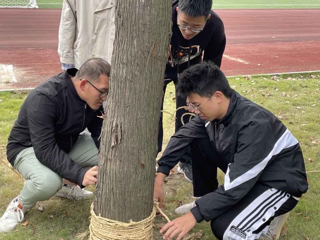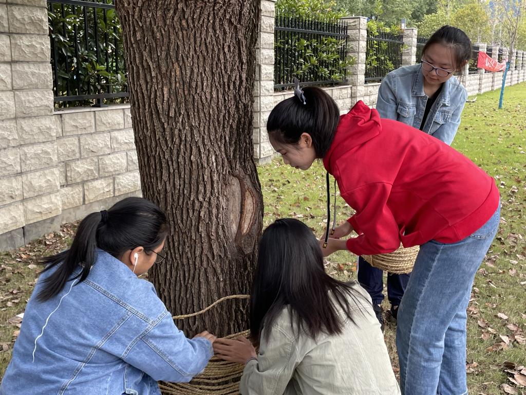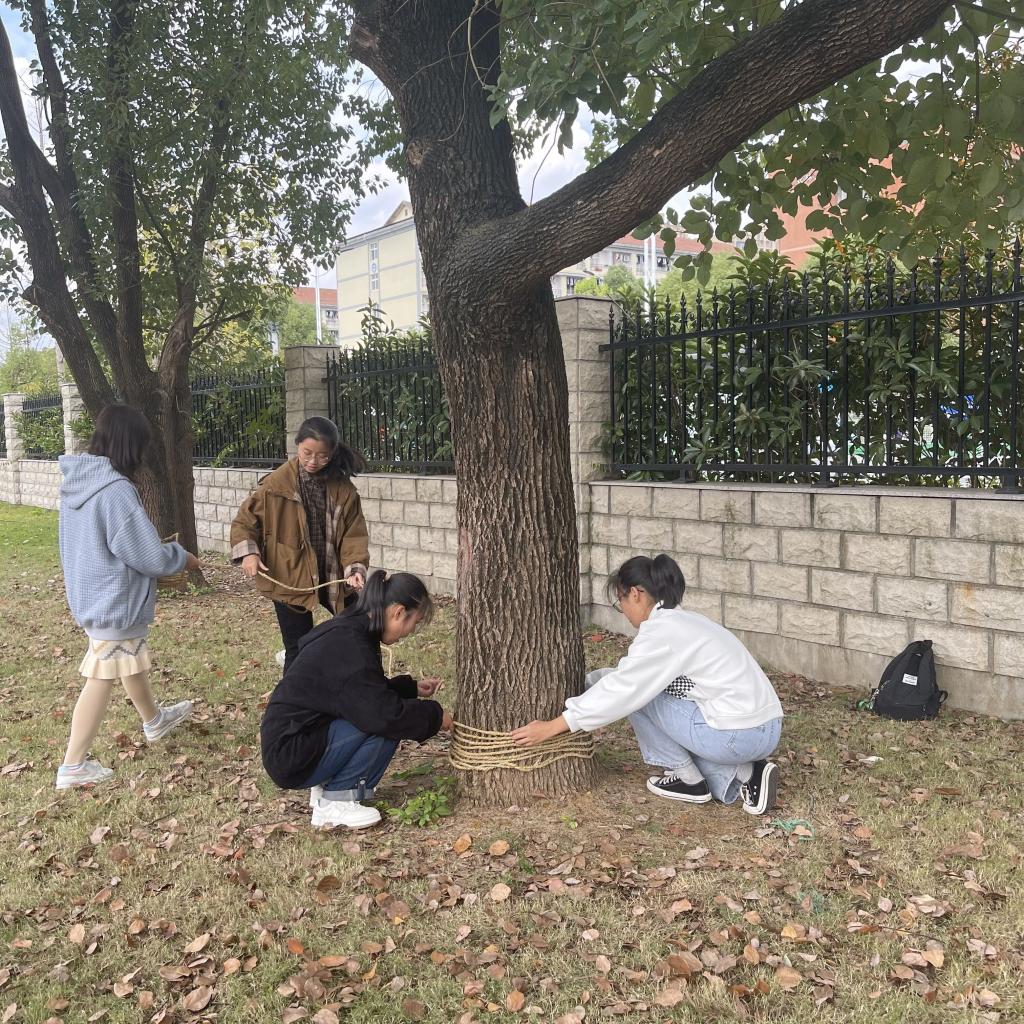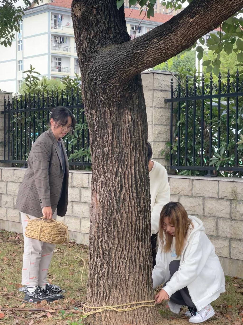 第三项,为操场上的大树绑上麻绳,以此达到御寒的效果,保护校园生态环境。