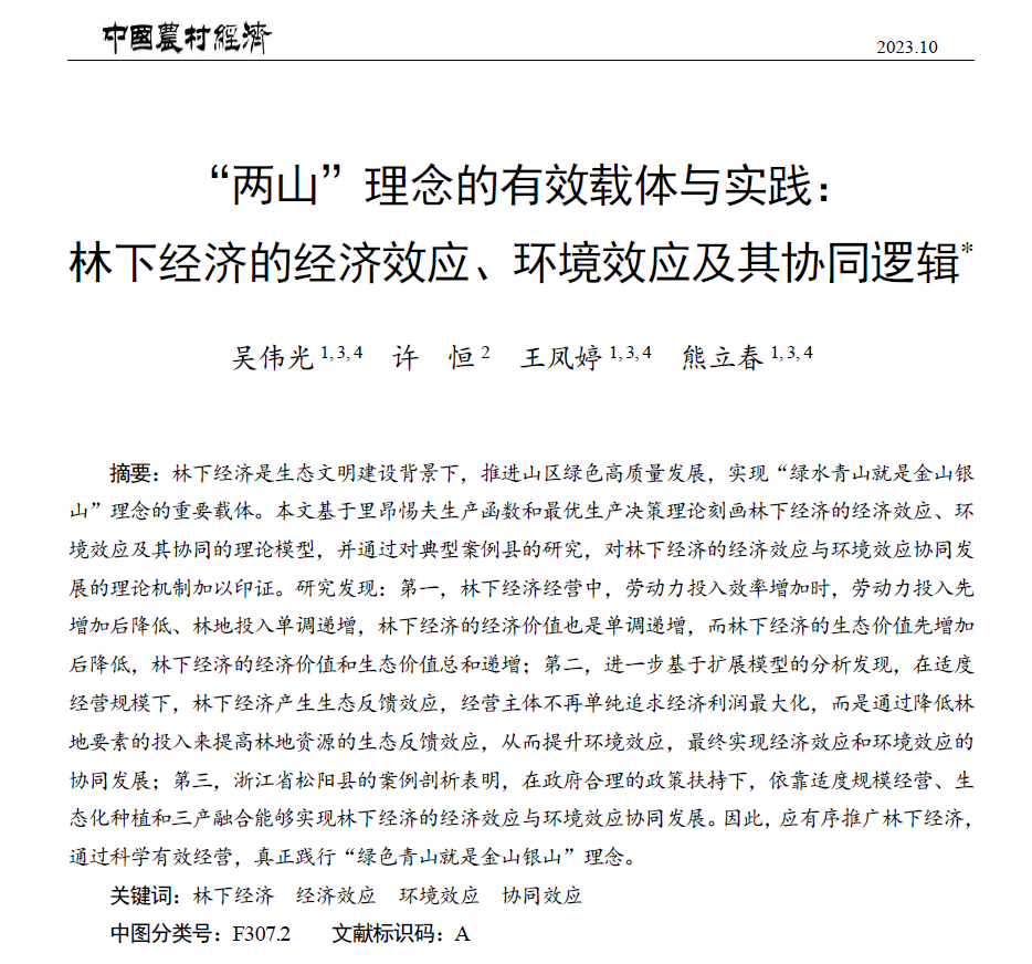 威尼斯官网吴伟光教授团队研究成果在《中国农村经济》发表 近日,学院吴伟光教授团队的研究论文《“两山”理念的有效载体与实践:林下经济的经济效应、环境效应及其协同逻辑》在知名期刊《中国农村经济》2023年第10期发表。该文通过经济学模型推理和典型案例分析得出如下观点:证明了林下经济经营活动在创造经济价值的同时同样会创造生态价值,当林下经济所形成的生态价值有利于当地生态环境提升时,经营主体经营的林下经济及其周边生态环境的经济价值也会显现,即产生正向的生态反馈效...