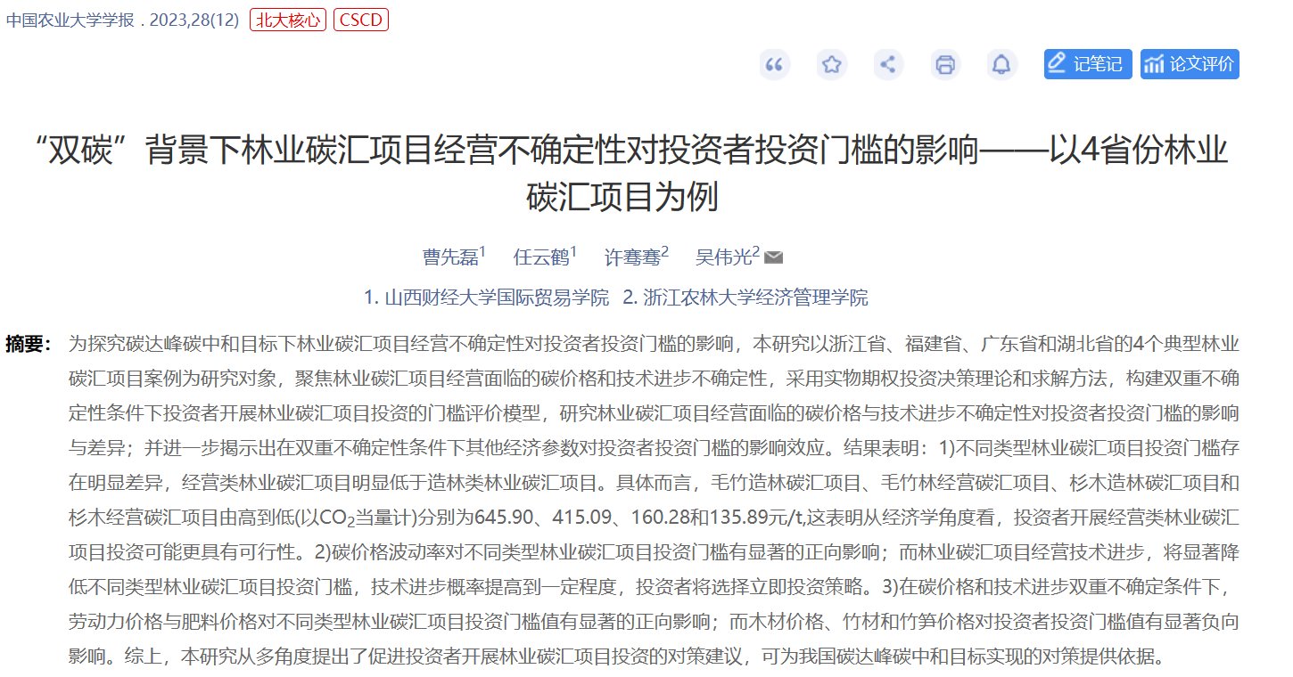 吴伟光教授团队研究成果在《中国农业大学学报》发表 近日,由威尼斯官网吴伟光教授与山西财经大学曹先磊副教授等人合作撰写的学术论文《“双碳”背景下林业碳汇项目经营不确定性对投资者投资门槛的影响——以4省份林业碳汇项目为例》在《中国农业大学学报》2023年第12期发表;中国农业大学学报为我校A类期刊。吴伟光教授为通讯作者。为探究碳达峰碳中和目标下林业碳汇项目经营不确定性对投资者投资门槛的影响,该论文以浙江省、福建省、广东省和湖北省的4个典型林业碳汇项目案例为研究对...